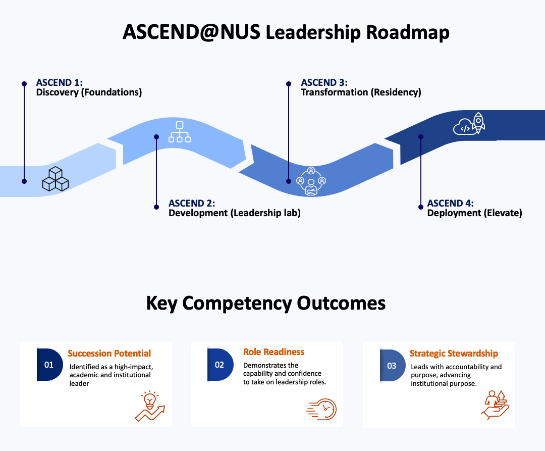 Develops confident, values-driven academic leaders to shape priorities and steward the NUS community through tiered coaching and experiential, impact projects—building leadership readiness and strengthening succession for resilient, forward-looking NUS.